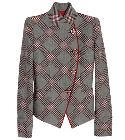パワーウーマンを彷彿とさせる力強いシルエット。英国ムード満載のチェック柄、そしてトレンドカラーの赤で今年らしさをプラスして。ジャケット¥442,800/ジョルジオ アルマーニ(ジョルジオ アルマーニ ジャパン)