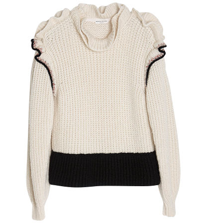 はっと目を引くラッフルがキュート。これだけでスタイルが出来上がる、主役級の一枚に。ニット¥159,840/ソニア リキエル(ソニア リキエル 青山店)