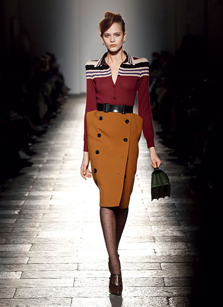 アーガイル柄が隠れているプリーツトップ。小気味いいパワーショルダーがポイントに。タートルトップ¥186,840/ボッテガ・ヴェネタ(ボッテガ・ヴェネタ ジャパン)