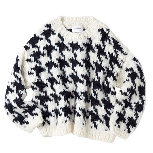 トラッドなムードのヘリンボーンニットも、太うねの編み地でぐっとラフなムードに。シルクなので、見た目からは想像できない軽さ! ¥199,800/ウェンデルボーン(エディション 表参道ヒルズ店)