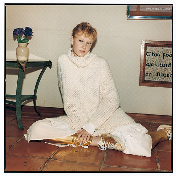 ゆったりとしたリラクシングなシルエットのハイネックニットに、素材感の異なるコットンのワンピースを合わせて。ノスタルジーを感じさせるアイテム同士の組み合わせに、フューチャリスティックなゴールドのレギンスとスニーカーで、近未来な輝きをプラスして。ニット¥57,240/エヴィ(RHC ロンハーマン) 中に着たワンピース¥70,200/マーレット(ユナイテッドアローズ 六本木ヒルズ店) ヴィンテージのゴールドレギンス¥10,800/ジャンティーク ピアス¥41,040/ホリー ライアン(エストネーション) カフ¥33,480/ディースクエアード(ディースクエアード 東京) スニーカー¥63,720/ゴールデン グース デラックス ブランド(ゴールデン グース デラックス ブランド 青山)