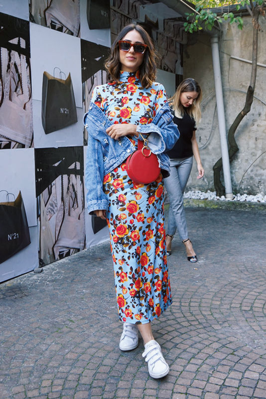 春らしいムードを足してくれるデニムジャケットは、ロングシルエットのアクセントに。花柄の色味と合わせたサークルバッグでより女らしく。