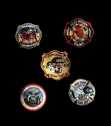 消防士たちによってデザインされたFDNYオリジナルの5種類のパッチが、黒のコートに映える。