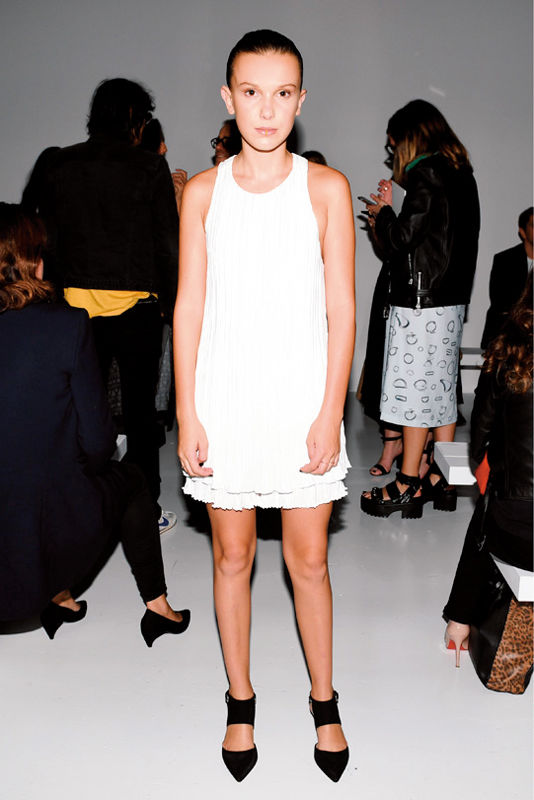 弱冠13歳にして、早くもカルバン・クラインでフロントローデビューした女優でモデルのミリー・ボビー・ブラウンが登場。ポインテッドトウのサンダルで、真っ白なワンピースに強さをプラス。