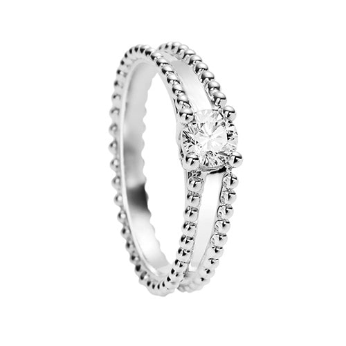 創業者のひとり、アルフレッド・ヴァン クリーフの愛妻エステル・アーペルの名を冠したリングは、愛を告げるのにこの上なくふさわしい。「エステル ソリティア」リング(PT×ラウンドダイヤモンド 0.30ct~)¥669,600~