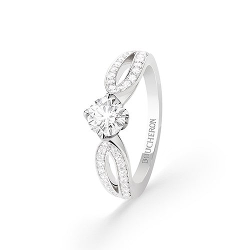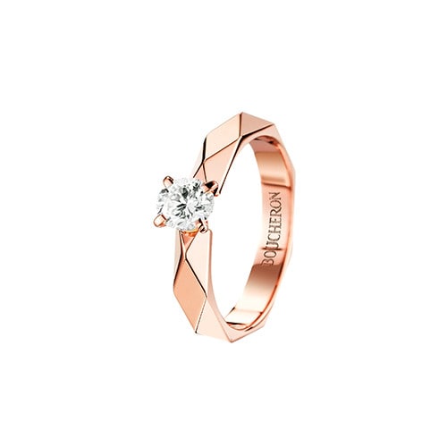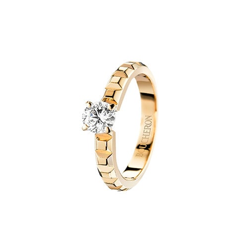 ブシュロンを代表するモチーフと、永遠の愛の象徴となるダイヤモンドの輝きが美しく調和。「クル ド パリ」リング(YG×ダイヤモンド センター0.2ct~)¥259,200~