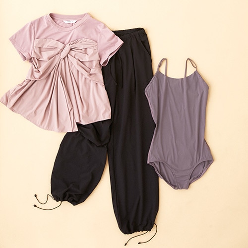 アクティブで美しくありたい女性を支持するダンスキン。リボンのように縛ったデザインがガーリーなトップやインナーとしても使えるレオタード、ほどよくワイドで動きやすいパンツは、それぞれリラックスしたサイズ感と色味で実用性抜群。