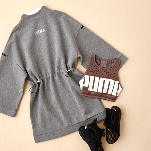 ワンピース¥8,640、ブラトップ¥4,860、スニーカー「フィナム バーシティ ウィメンズ」¥11,880/以上プーマ(プーマ お客様サービス)