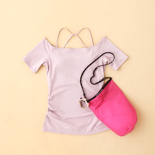 フレンチスリーブトップ¥8,964/エミ ヨガ、サコッシュ¥3,780/ダンスキン×エミ、リストバンドウォッチ「ヴィヴォスポーツ」¥24,800/ガーミン×エミ(以上エミ ニュウマン新宿店)