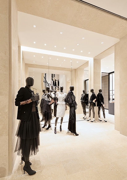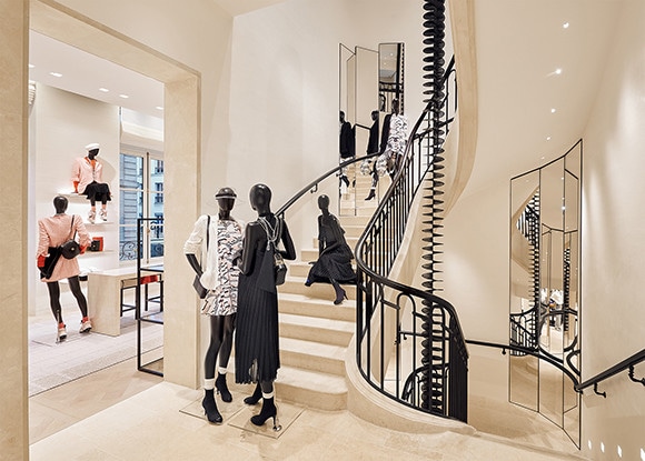 1階はシューズやジュエリー、2階はバッグやレザーグッズ、そして3階にはレディトゥウエアにメティエダール、クルーズにコスメティックラインと、シャネルのプレシャスなコレクションがずらり。シャネルが誇るメティエダール、ルサージュが手がけた刺繍入りのカーテンや、グーセンスが製作したクリスタルとブロンズを使ったミラーなど、贅沢なインテリアにも注目したい。