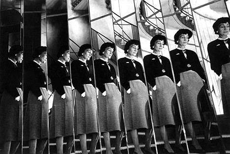 1954年、カンボン通り31番地ブティックの、クチュールサロンへ続く階段の鏡の前で。ロベール・ドアノーが撮影したガブリエル・シャネル。 © CHANEL