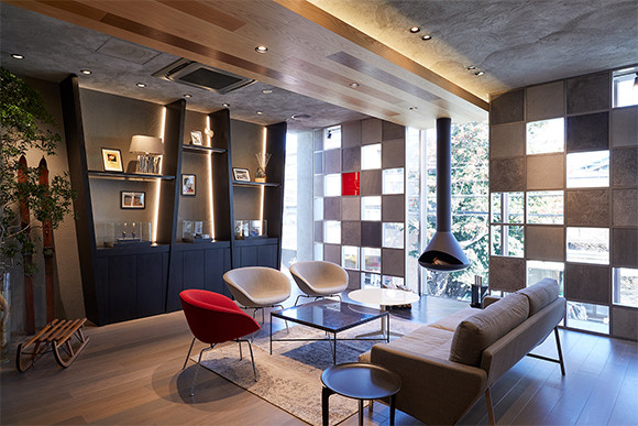 スイス湖畔の別荘「シャレー」に着想を得た、上質で温かみのある2階のラウンジ。2月14日~3月14日は、フォトエキシビション「HELLO DAIKANYAMA」を開催。