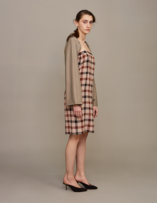 チェックドレス¥60,480、スリーブアクセサリー¥60,480/ともにロック(アデライデ) ミュール¥85,320/セルジオ ロッシ(セルジオ ロッシ カスタマーサービス)