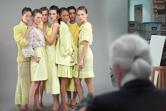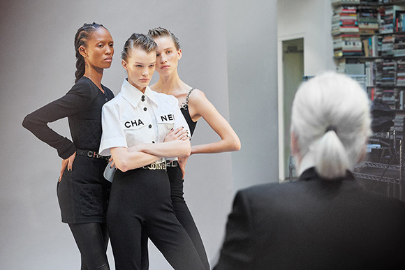 カール・ラガーフェルドが構えるカメラの前に立つモデルたちをとらえたオフショット。 photo : OLIVIER SAILLANT