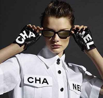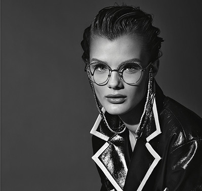 カールが手がけたアイウエアのキャンペーンビジュアルには、モデルのヴィットリア・チェレッティとクリス・グリカイテを起用。コスチュームパールやチェーン、ゴールドなどシャネルのコードを散りばめた最新のアイウエアをフィーチャーした。