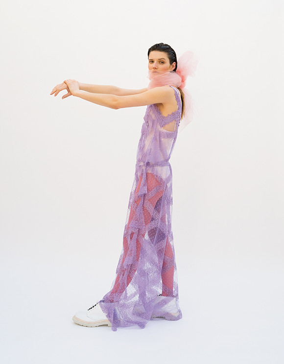 いま注目のライラックは、スモーキーピンクを合わせてロマンティックに纏いたい。レースのコンビネゾンからベロアのボディスーツを覗かせ、真っ白なワークブーツをハズシに。