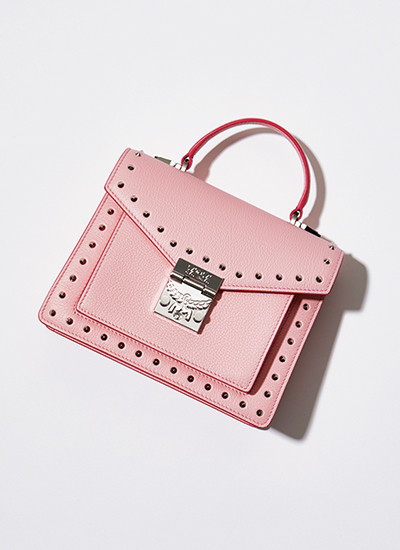 スパイクスタッズが甘いピンクを引き締める。バッグ(H16.5×W21×D8㎝)¥128,520/エムシーエム(エムシーエム 銀座 ハウス 1)