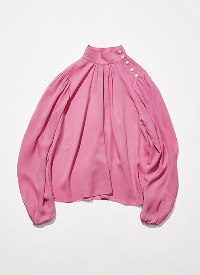 ドレープの表情が美しいハイネックブラウス。首元のシェルボタンも上品。¥52,920/ロバート ロドリゲス(イザ)
