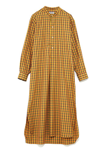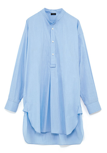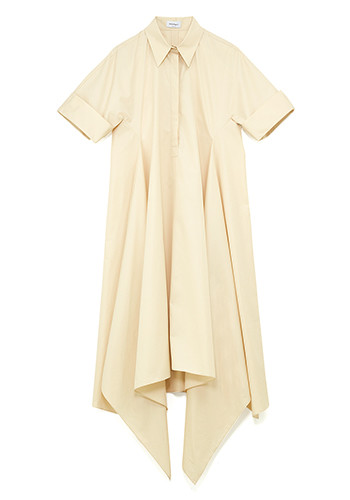 潔く、クリーンなノーカラーのシャツドレス。裾のカッティングも美しい。¥38,880/ジョゼフ(オンワード樫山 お客様相談室)