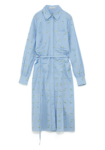 小花柄の刺繍が施されたシャツドレス。共布の華奢なウエストベルトとサイドのシャーリングでどこまでも可憐に。¥149,040/アルチュザラ(リステア)
