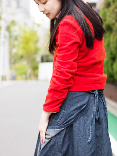 中に着たデニムのスカートは、実はマタニティエプロンなんです。一枚布になっていて、飛行機の中でも脱ぎ着がしやすい。衣装合わせの日にもよく着ています。