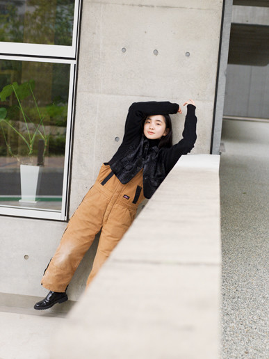 ジャケット/ノワール ケイ ニノミヤ、中に着たハイネックニット/スドーク、オーバーオール/ディッキーズ、ブーツ/ザラ