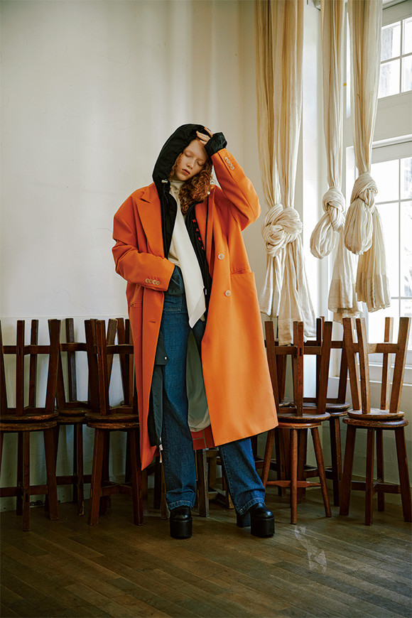 オレンジ色のコート¥77,760/アイレネ(ルシェルブルー カスタマーサービス) ブラウス¥35,640/ジョゼフ(オンワード樫山 お客様相談室) 中に着た白のドローストリングドレス¥37,800/ラインヴァンド(エムエイティティ.) 中に着たメンズのフードジャケット¥45,360/ディーゼル(ディーゼル ジャパン) ブーツ¥79,920/ジョン ローレンス サリバン