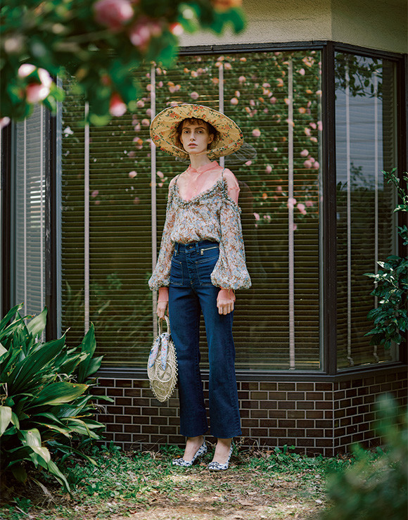 オフショルダーブラウス¥122,040/ステラ マッカートニー(ステラ マッカートニー カスタマーサービス) 中に着たブラウス¥60,480/フォルテ フォルテ(コロネット) 帽子¥27,000/スグリ バングル¥149,040/シャルロット シェネ(エドストローム オフィス) 花柄ビジューパンプス¥172,800/マノロ ブラニク(ブルーベル・ジャパン ファッション事業本部) ストロー素材バッグ¥25,920/グアダルーペ デザイン(ビューティ&ユース ユナイテッドアローズ 湘南店) バッグに付けたスカーフ¥14,040/リバティ ロンドン(リバティジャパン)