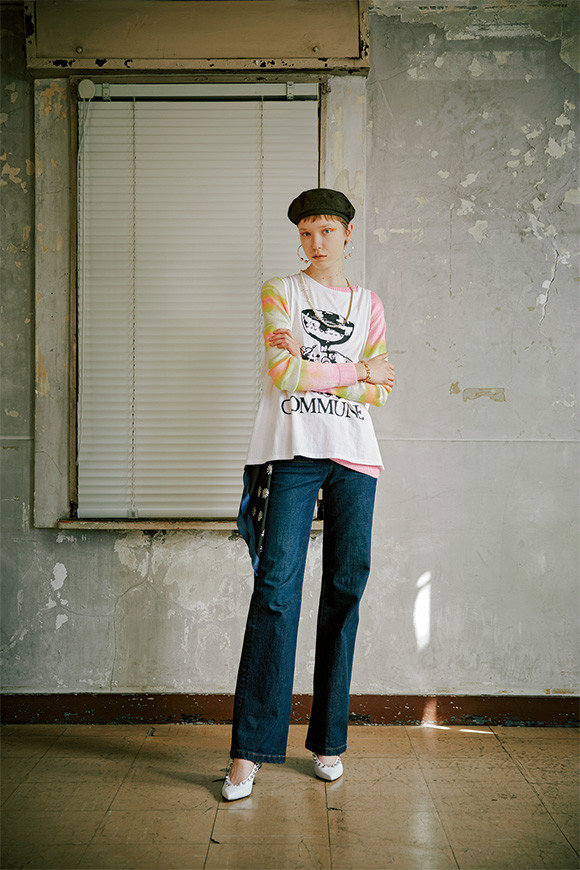 タイダイ染めニット¥147,960/ジ エルダー ステイツマン(サザビー リーグ) Tシャツ¥11,880/アリーズ(コンコード ショールーム) ベレー帽¥16,200/ミュールバウアー(トゥモローランド) ピアス¥2,484/チープ マンデー(k3 オフィス) ネックレス¥81,000/ソーイ(エム アイ ユー) スカーフ¥1,620/ハナ タジマ フォー ユニクロ(ユニクロ) シューズ¥113,400/セルジオ ロッシ(セルジオ ロッシ カスタマーサービス) ブレスレット/スタイリスト私物
