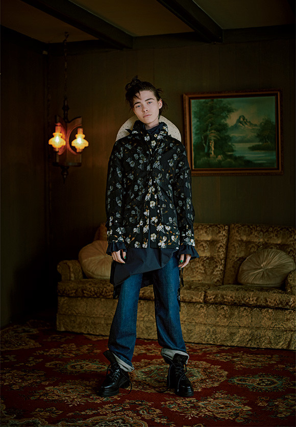注目したいワークスタイルのひとつが、ガーデニング。フレアパンツをロールアップすることで、少し野暮ったいくらいのユニークなシルエットが生まれる。同じくゆったりとしたシルエットの花柄シャツにシースルーシャツを重ねて。ストローハットとワークブーツもポイントに。
