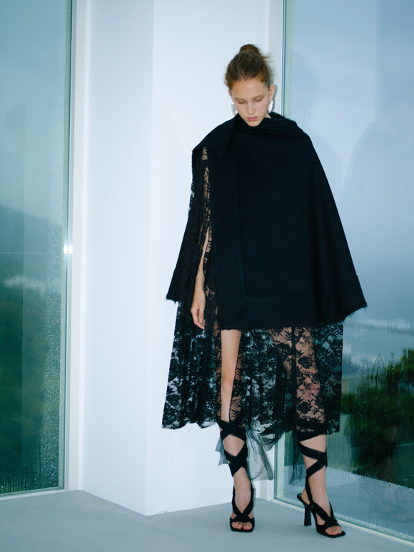 「どのコーディネートにも通じるのですが、基本的にはシンプルなアイテム、組み合わせが好き。“さり気なさ”や“調和”を大事にしています。このルックは、ウールとレース、同じブラックのケープを重ねることでコントラストをつけました。クラシカルになりすぎないよう、ほかの要素はできるだけ引き算してモダンな印象に」