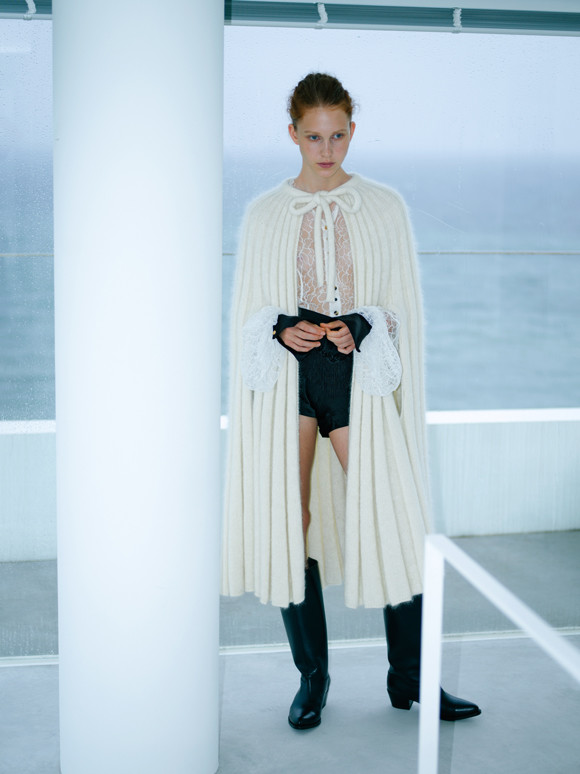 ケープ¥567,000/ジル サンダー (ジルサンダージャパン) 中に着たレースのケープ¥224,640/プラダ(プラダ クライアントサービス) ピアス¥84,240/バーバリー(バーバリー・ジャパン) オーガンザレースアップサンダル(参考商品)/ジェイ ダブリュー アンダーソン(エドストローム オフィス)