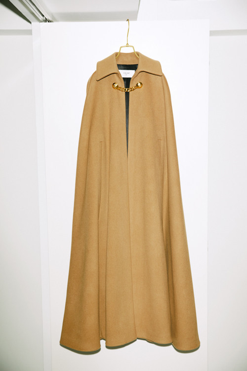 厚手のカシミアコートは美しいフォルムで圧倒的な存在感を放つ。ゴールドのチェーンがキャメルの上で上品さを添える。ケープ¥1,015,200/セリーヌ バイ エディ・スリマン(セリーヌ ジャパン)