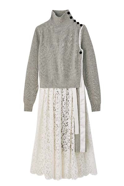 プルオーバーニットの背中は、レース使い。定番を女性らしくツイスト。ワンピース¥151,800/サカイ(バーニーズ ニューヨーク カスタマーセンター)