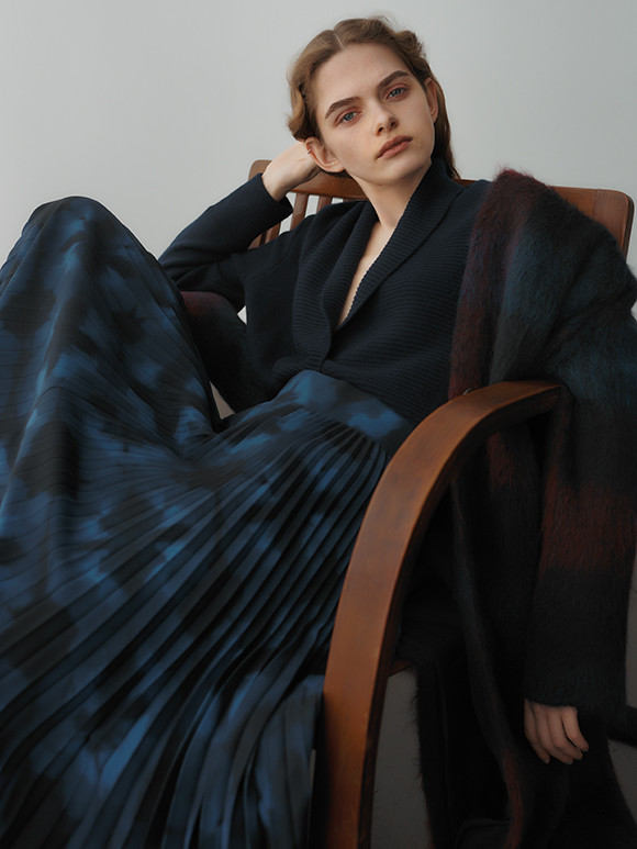 ブランケットコート¥158,070、ニットカーディガン¥62,700、プリーツスカート¥67,430/以上ヴィンス(ヴィンス 表参道店)