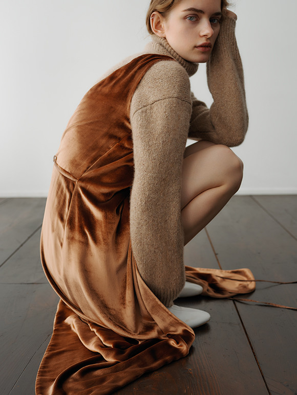 ブラウンの光沢が美しいベロアのワンピースは、紐やボタンで調整をして、一枚でもパンツなどとレイヤードしても楽しめる。寒さが厳しい冬には、肌触りのよい暖かなカシミアのニットをインナーにして着こなしたい。