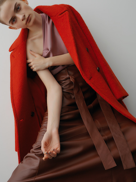 自然界のなかで突如として出現する鉄の彫刻作品のように、はっきりとした赤色が主張するロング丈のPコートスタイル。着心地のよい肉厚な生地には、同じトーンでも異なるテクスチャーを合わせ、ブラウスはオフショルダーというアレンジを利かせてセンシュアルに。