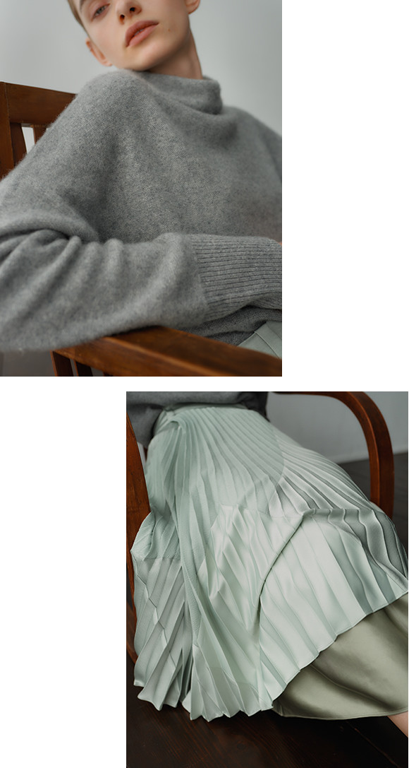 ふんわりとしたボイルドカシミアのシンプルなニットには、スカートのレイヤリングで違和感というアクセントを。手工芸を感じさせる、質感が異なる布地のパッチワークのようなスカートのインナーには、同じグリーントーンのワンピースを覗かせて。