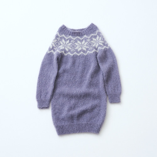 雪の結晶を描いたニットワンピースは、冬空を思い起こすような淡いパープルがミステリアス。同系色のタイツと一緒に。ニットワンピース¥41,800/ハーレー オブ スコットランド フォー RHC(RHC ロンハーマン)