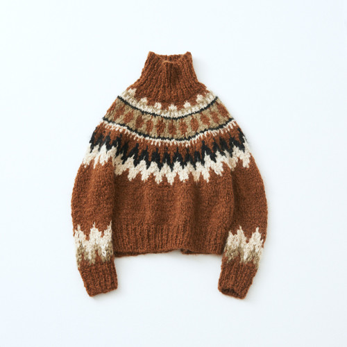 ノルディック柄のカーディガンと、フラワープリントのシャツドレスがドッキングした一着。サイドのスリットがナチュラルな抜け感を演出し、シャツの襟をのそかせれば、ノルディックのほっこりしたムードにフォーマルな気品が加わる。手先まで隠れるほどのロングスリーブとルーズソックスの緩さがリンクした、ガーリーなニットスタイルの完成。
