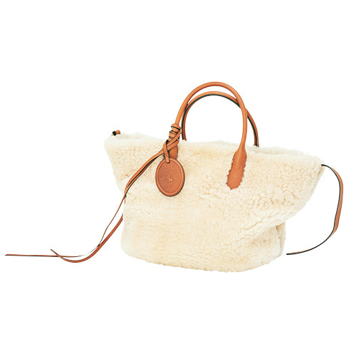 ナチュラルカラーのシアリングファーの内側はグリーンのタータンチェックで、リバーシブルで使える。トートバッグ「ベルポート」(ストラップ付き、H28×W28×D16㎝)¥114,480/ポロ ラルフ ローレン(ラルフ ローレン)