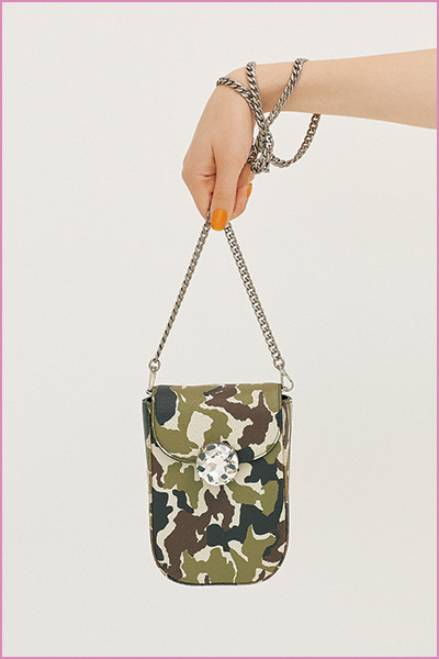 クラック加工を施したカモフラージュ柄のレザーと特大ラインストーンのギャップがたまらない。ショルダーバッグ(H17×W11×D3.7cm)¥150,120(予定価格)/ミュウミュウ(ミュウミュウ クライアントサービス)