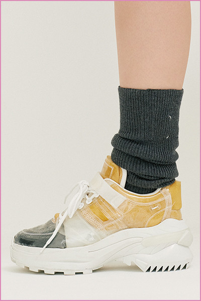 アッパーをPVCでカバーした新モデルは、内部のフェルトやスポンジが透けて見えるスケルトンデザイン。「レトロ フィット」(ソール6.5cm)¥162,000、ソックス¥27,000/ともにメゾン マルジェラ(メゾン マルジェラ トウキョウ)