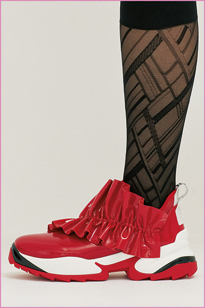 取り外しできるマキシフリルと、そのボリュームに拮抗するソールが迫力満点。「セルジオ エクストリーム」(ソール1cm)¥100,440/セルジオ ロッシ(セルジオ ロッシ カスタマーサービス) ソックス¥3,132/ピエールマントゥー(ステッラ ピエールマントゥー事業部)