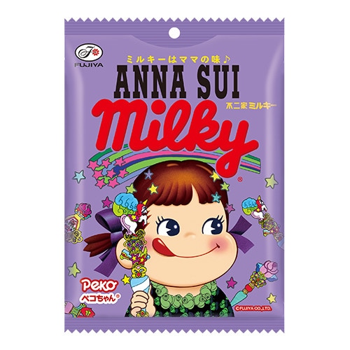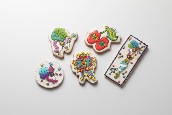 ヤナギダマサミコラボレーションアイテムは、スエットシャツやTシャツといった服のほか、ワッペン、マグカップ、iPhoneケースなども。また、マエダサチコのキャンドルブランド「ヴィーダフェリス」とのトリプルコラボレーションによるサシェやキャンドル、アイシングクッキーが人気のパティシエ「micarina」からは、ハンドメイドの限定クッキーを販売。そして老舗菓子メーカー、不二家の「ミルキー」とアナ スイ初のコラボレーションも、ヤナギダマサミとのトリプルコラボレーションで登場。