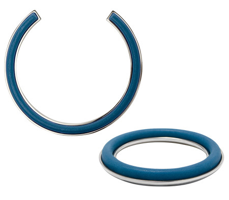 鮮やかなブルーに染められたレザーとシルバーのクールなコンビネーション。