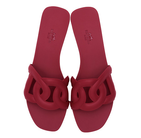 アイコニックな「シェーヌ・ダンクル」のモチーフをアッパーにあしらったラバーサンダル「アロハ」。新色はドラマティックなローズレッド。