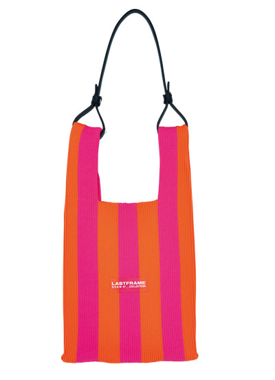 マーケットバッグをベースに、ポップな色合わせのリブ編みで仕立てて。レザーストラップは取り外して使うこともできる。