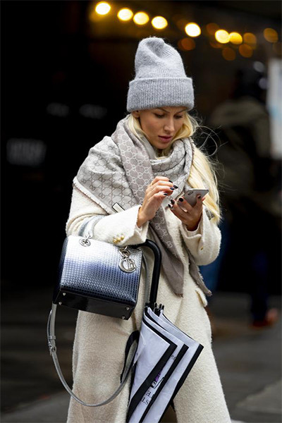 計算され尽くしたシルエットにふさわしい、デザイン性の高い帽子に挑戦した人もいた。自然な色合いのクローシュ帽子や黒のフェドラハットも主張の強いデザインだが、大胆さではやはり、大ぶりのカプリーヌに軍配が上がる。レインキャップに近いつば広のカプリーヌは、トレンチコートやロマンティックなブラウスとも相性抜群だ。
