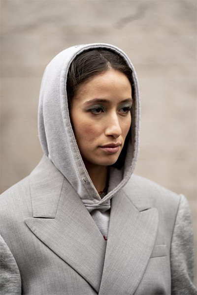 ヘアスタイルでも、複数のトレンドが浮上。ロングヘアをなびかせる人もいれば、耳の後ろですっきりとまとめている人も。また、帽子の中に髪をすっぽりと収めている人も目についた。